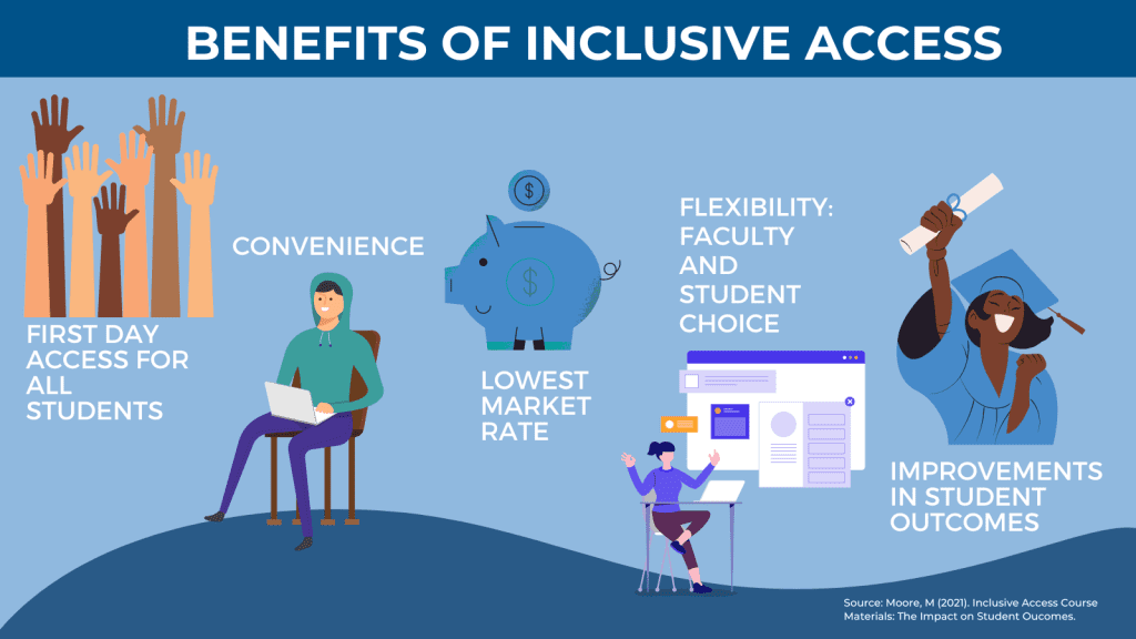 The benefits of Inclusive Access range from first-day access, to affordability, to improving student outcomes for success.