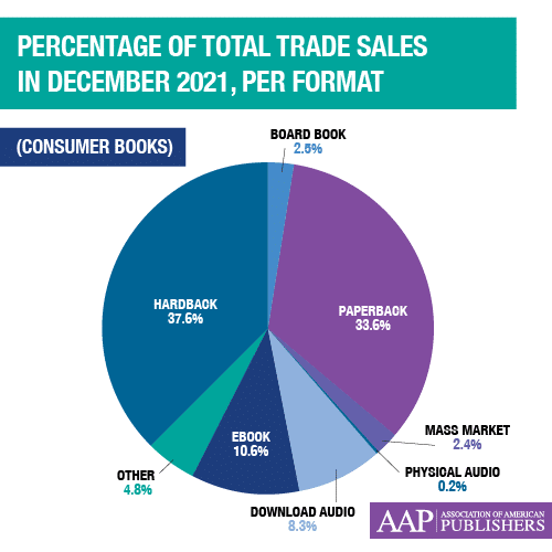 Trade (Consumer) revenues were up 11.8%, at $9.5 billion for the calendar year. Hardback revenues were up 11.3%, coming in at $3.7 billion; Paperbacks were up 18.8%, with $3.1 billion in revenue; Mass Market was up 5.5% to $240.9 million; and Board Books were up 9.7%, with $212.1 million in revenue.