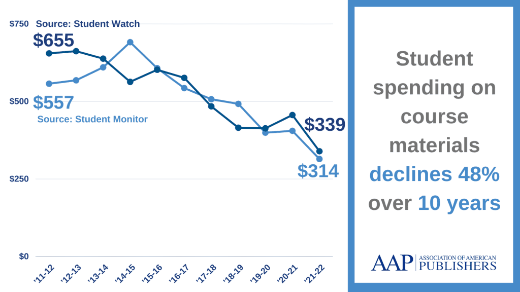 Similarly, independent research firm Student Monitor found that average student spending on college course materials, including textbooks and digital materials, declined 22 percent going from $405 last year to an average of $314 for the 2021-2022 academic year.
