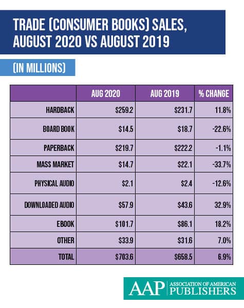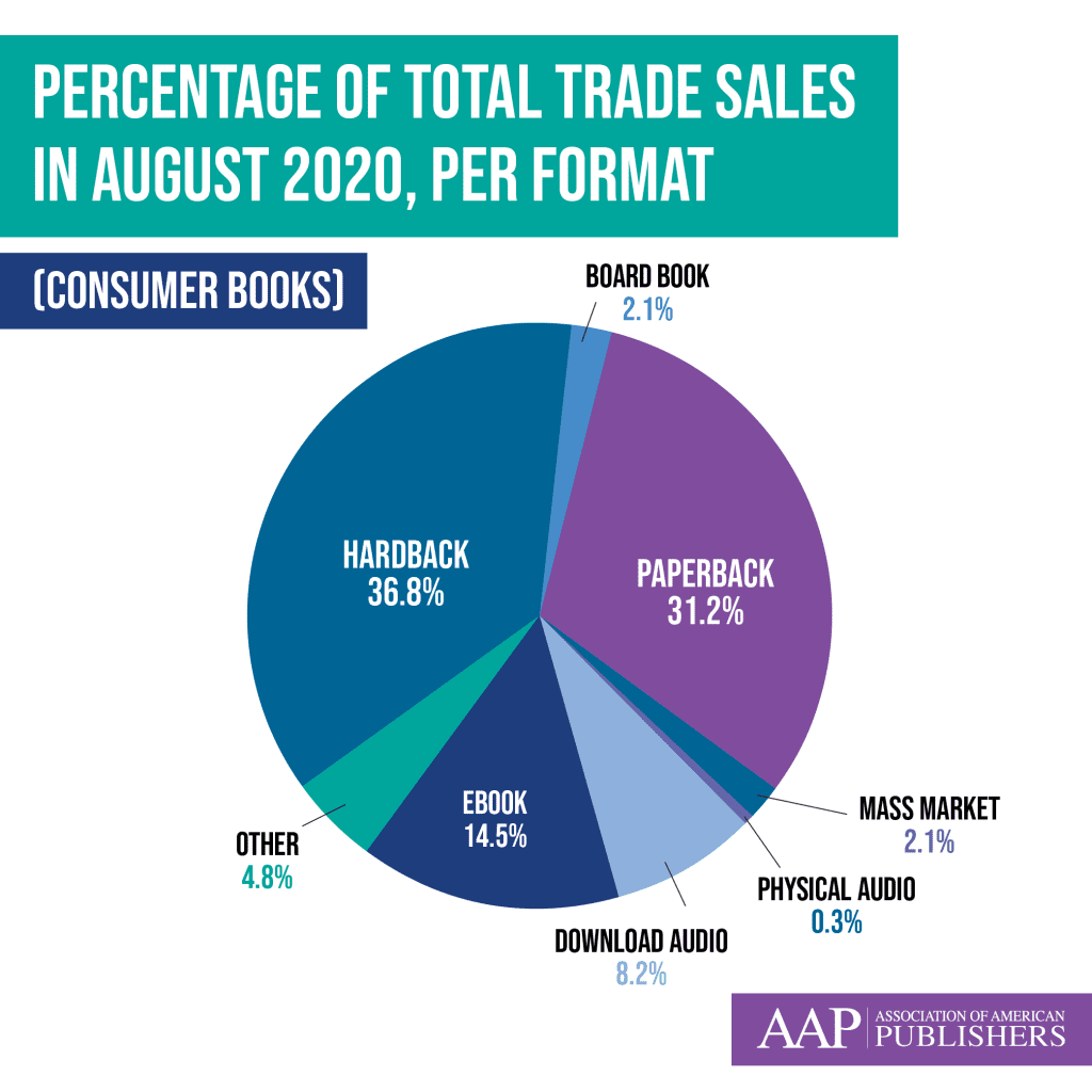 In terms of physical paper format revenues during the month of August, in the Trade (Consumer Books) category, Hardback revenues were up 11.8%, coming in at $259.2 million; Paperbacks were down 1.1%, with $219.7 million in revenue; Mass Market was down 33.7% to $14.7 million; and Board Books were down 22.6%, with $14.5 million in revenue.