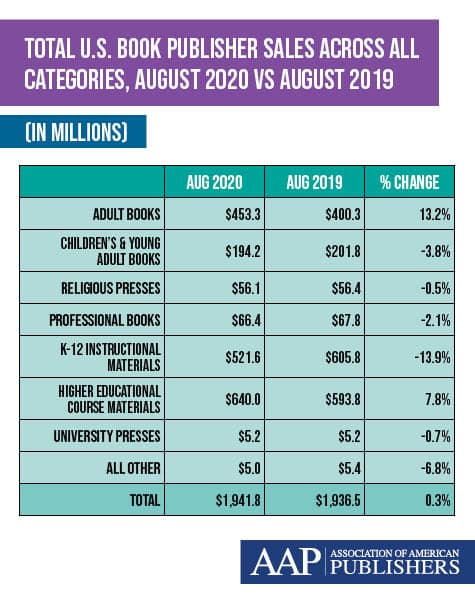 AAP AUGUST 2020 STATSHOT REPORT: PUBLISHING INDUSTRY FLAT FOR MONTH; DOWN 4.6% YEAR TO DATE