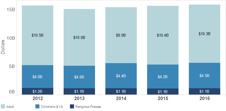 Publisher revenue for trade books grew by $231 million from 2015 to 2016. American publishers sold nearly 2.5 billion trade books, including print, eBook and audiobooks.