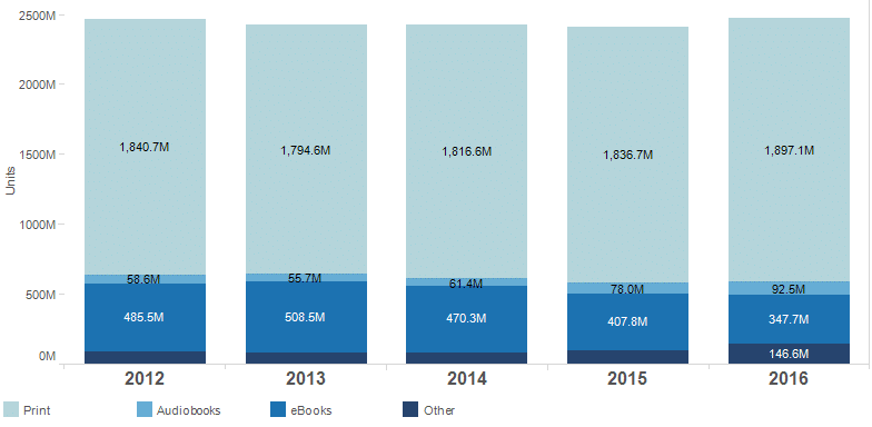 Print books account for 70.6% of all units sold; eBook revenues decline